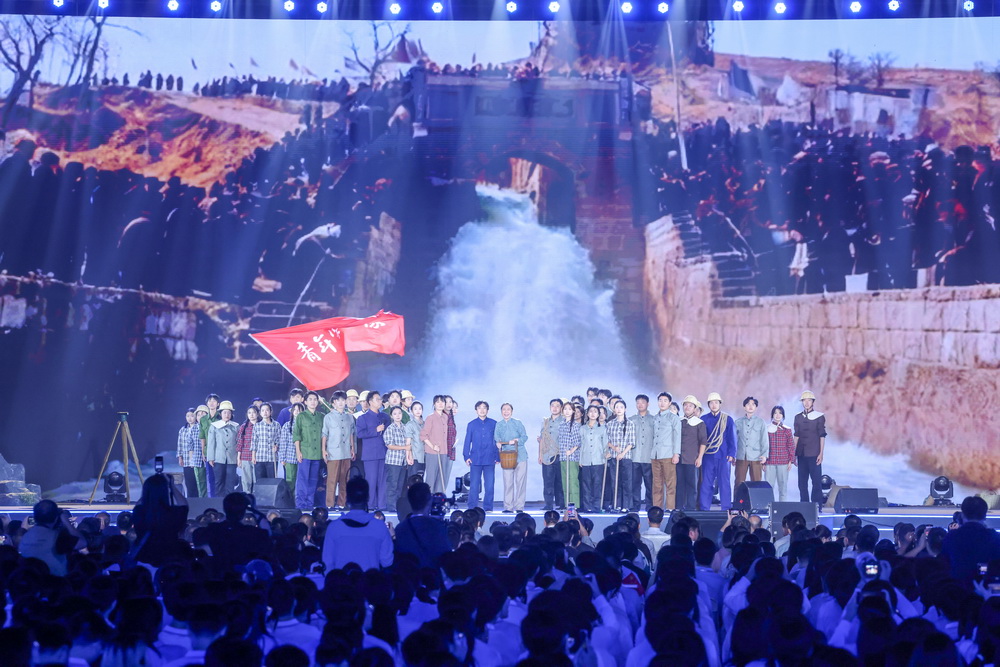 红旗渠全长1500公里、参与修建人数近10万,耗时近10年,是“新中国奇迹”,被誉为“世界第八大奇迹”。今年是红旗渠总干渠通水60周年,演员林永健和修渠人及其后代再现当年战天斗地的感人故事,精彩的演绎让不少同学红了眼眶。