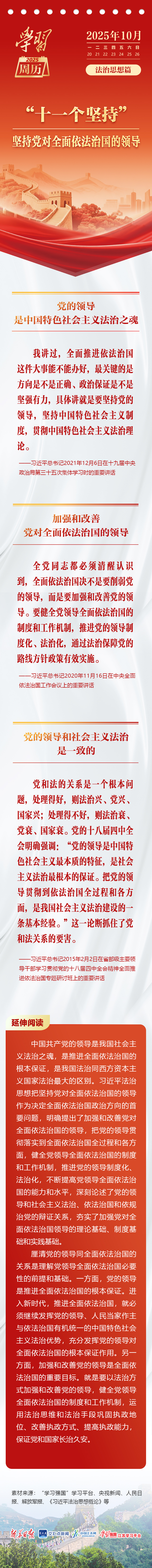 今年是习近平法治思想提出五周年,《学习周历》特别推出“法治思想篇”,深入学习习近平法治思想的核心要义,深刻把握其丰富内涵。本期,让我们一起学习“坚持党对全面依法治国的领导”。