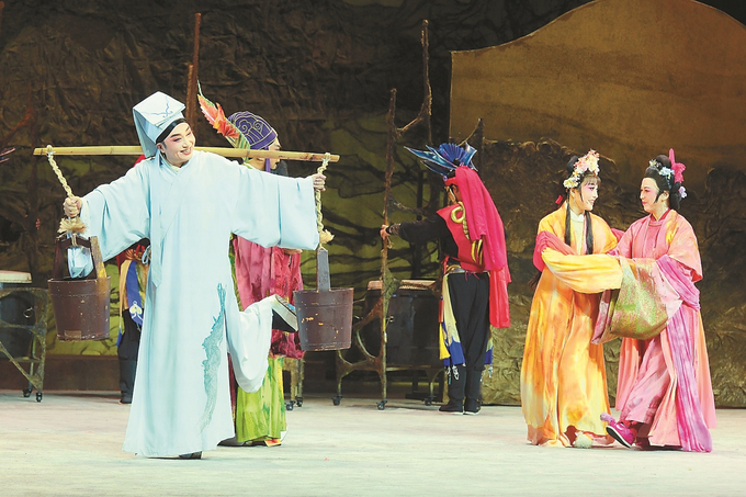 通剧作为流行于南通地区的地方戏曲,其源头可追溯至千年以上的“童子戏”。南通市通州歌舞团(通剧团)复排的通剧《陈英卖水》,对情节做了最大限度的凝练,将通剧最具代表性的“锣鼓”元素融入舞台装置,构建出“一桌二椅”的新格局。团长季新华介绍,《陈英卖水》在音乐设计上既保留通剧的古老形态,融合巫戏与傩戏元素,以叙唱方式推进剧情,又巧妙融入现代音乐元素。地道的南通方言演唱,充满浓郁的地方特色。