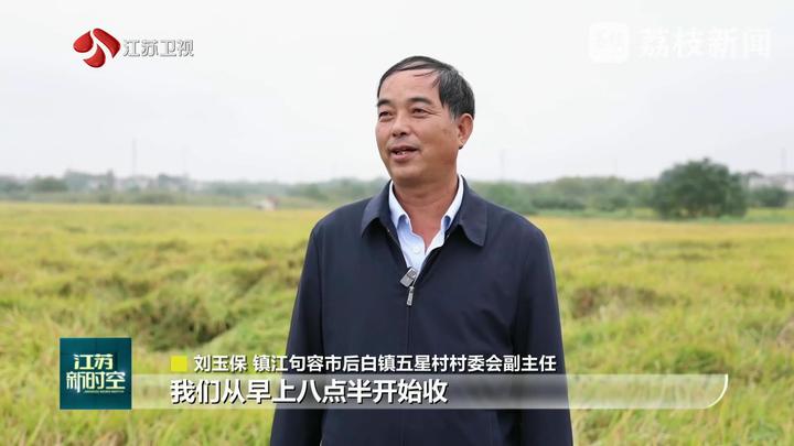 镇江句容市后白镇五星村村委会副主任刘玉保说:“因为后面有雨,我们组织了四台收割机,从早上八点半开始收割,一直到晚上六点。”