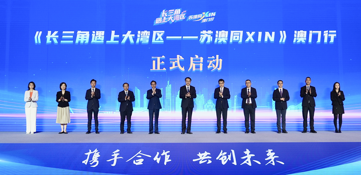 江苏省人民政府副省长赵岩,中央政府驻澳门联络办公室宣文部部长万速成,江苏省人民政府副秘书长徐华勤,江苏省委宣传部副部长、省委网信办主任杨力群,江苏省商务厅厅长司勇,江苏省港澳办副主任沈雁飞,澳门江苏社团总会会长何嘉慈,澳门新媒体联盟主席、澳门商报社长朱海生,江苏省广播电视总台副台长、集团副总经理季建南,澳广视中文新闻及资讯节目部总监刘婧,澳门莲花卫视副台长李虹祎出席当天活动并启动《长三角遇上大湾区——苏澳同XIN》澳门行活动。