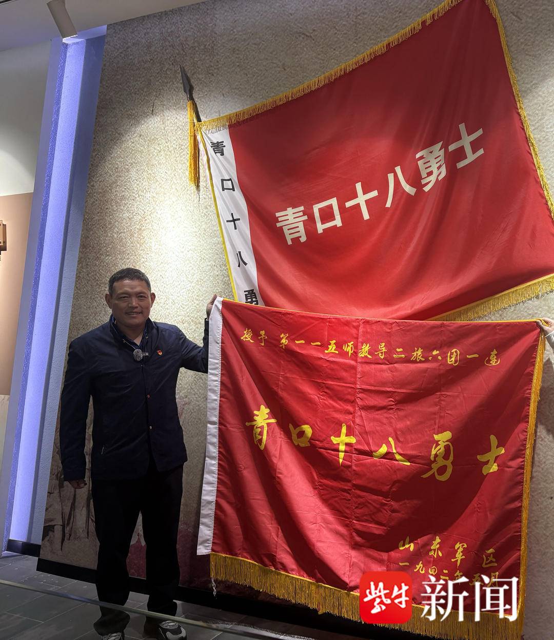 9月下旬,陆军某部代表郑重将这面二次受阅的“青口十八勇士”荣誉战旗赠予位于连云港赣榆区的青口十八勇士纪念馆,战旗跨越山海,从英雄连队回到了“故乡”。10月,扬子晚报紫牛新闻记者来到青口十八勇士纪念馆,青口镇退役军人服务站站长、纪念馆负责人徐志向记者展示了这面珍贵的战旗:“从1941年的那场战斗,到抗美援朝战场,再到如今和平年代,这面战旗背后的故事诉说着一代又一代的英雄部队宁死不屈、为国争光的光荣传承。战旗的故事,应该被更多人知道!”