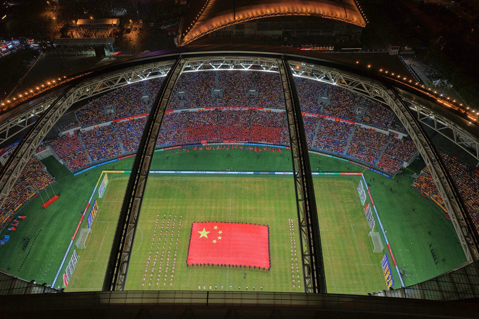 10月7日,“苏超”淘汰赛1/4决赛南通主场对阵淮安,南通体育会展中心顶盖打开。许丛军摄