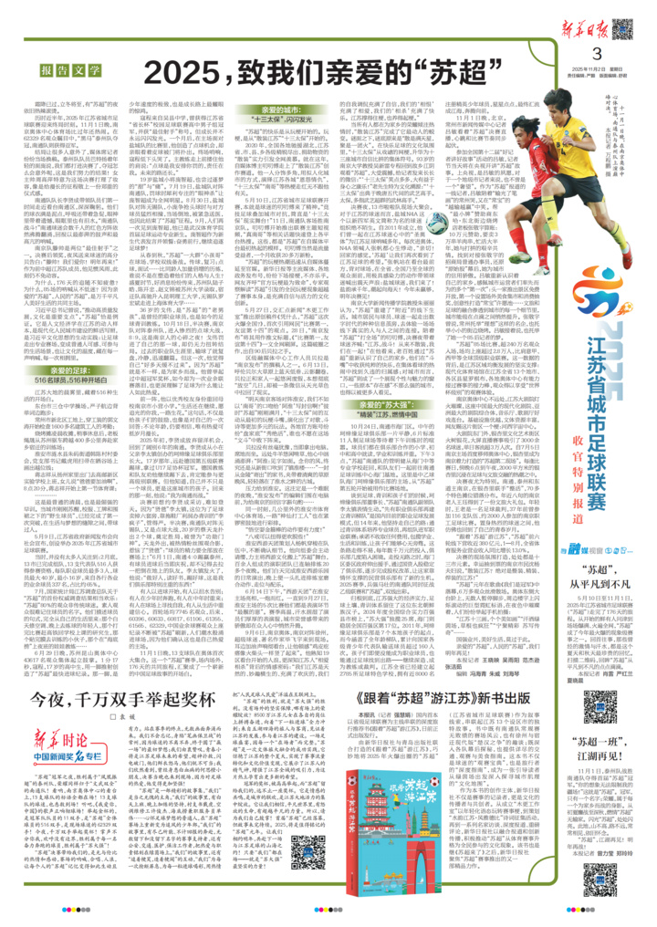 习近平总书记曾说,“推动高质量发展,文化是重要支点”。“苏超”恰是例证。它是人文经济学在江苏的动人样本,是现代化人民城市建设的鲜活写照,是习近平文化思想的生动实践:让足球走出专业赛场,变成普通人可感、可参与的生活场景,也让文化的温度,藏在每一声呐喊、每一次相拥里。