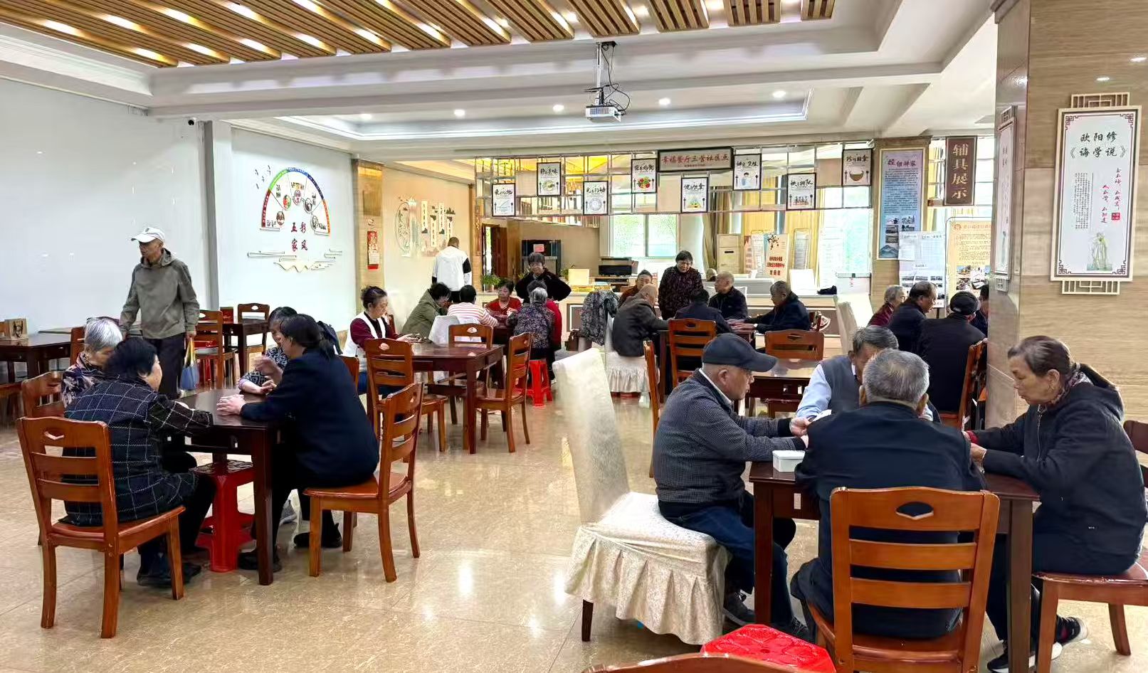 黄家琦说:“我们在这里过得蛮好。上下午打牌、打乒乓球、台球,社区还举办一些讲座,提高老年人的生活质量,中午还有饭吃。这里的条件也比较好,每天都有百十名老年人来。”