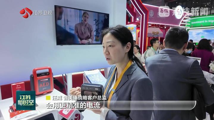 荔枝新闻中心记者范洁萍说:“第八届进博会国家馆首次设立中外友好城市展区,江苏南京与德国斯图加特市作为首对参展友城,在这儿呈现了两个城市30年的友好合作成果。比如说我身旁的这个,造型是不是很特别呢?它就是两地共同合作研发出来的最新款的AED产品。”