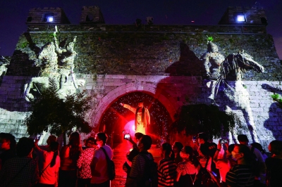 暮色降临,中华门瓮城内上演大型沉浸式光雕艺术演出。