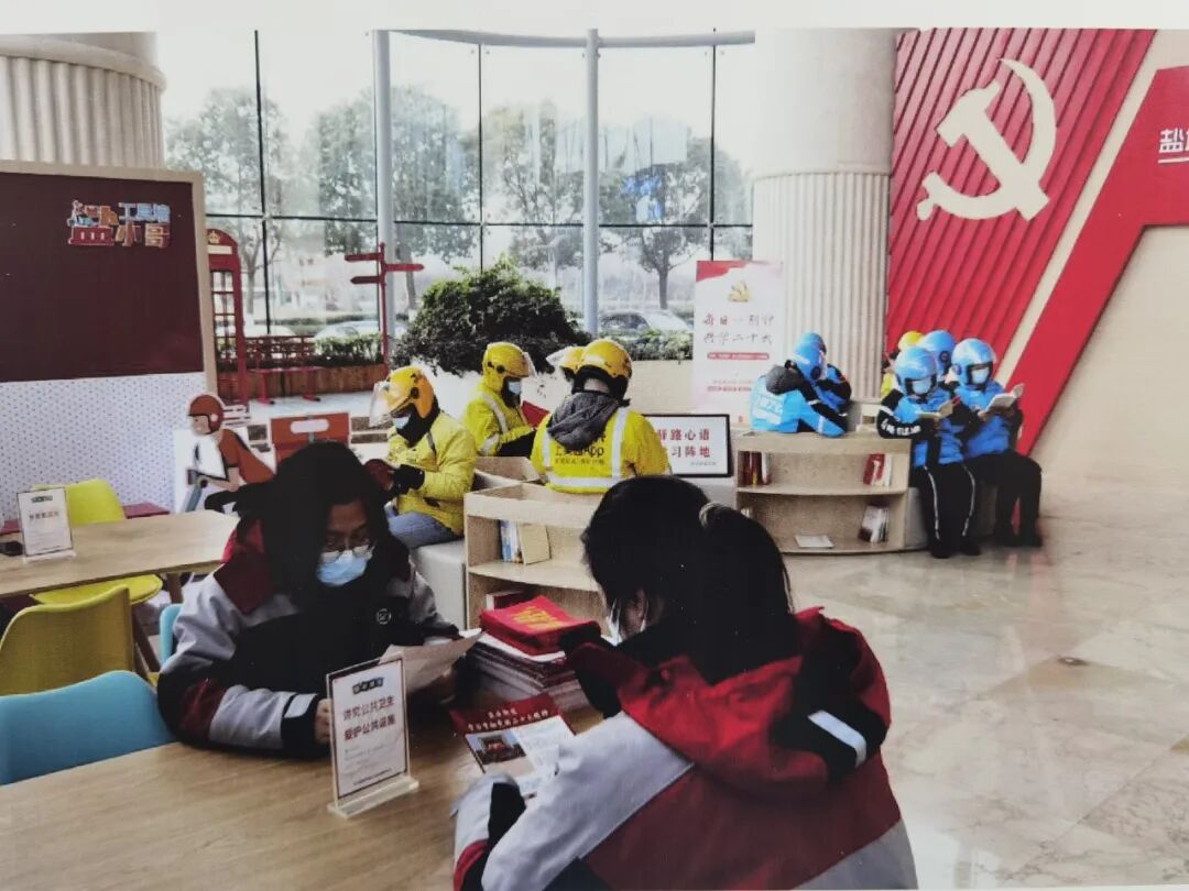 吃完午饭,不少外卖员来到隔壁的党群服务中心。宽敞的大厅里,职工读书角、饮水机、微波炉、冰箱、医药箱、充气泵、雨伞等设施一应俱全,还提供免费饮水、智能充电、应急药品、无线网络等温馨服务。区委组织部工作人员告诉记者:“按‘八有’要求,盐都整合村(社区)党群服务中心、街道便民服务中心、商圈等阵地资源,打造基础型服务站点70个、枢纽型服务站点2个,人流量高的站点日均可服务50人次以上。”
