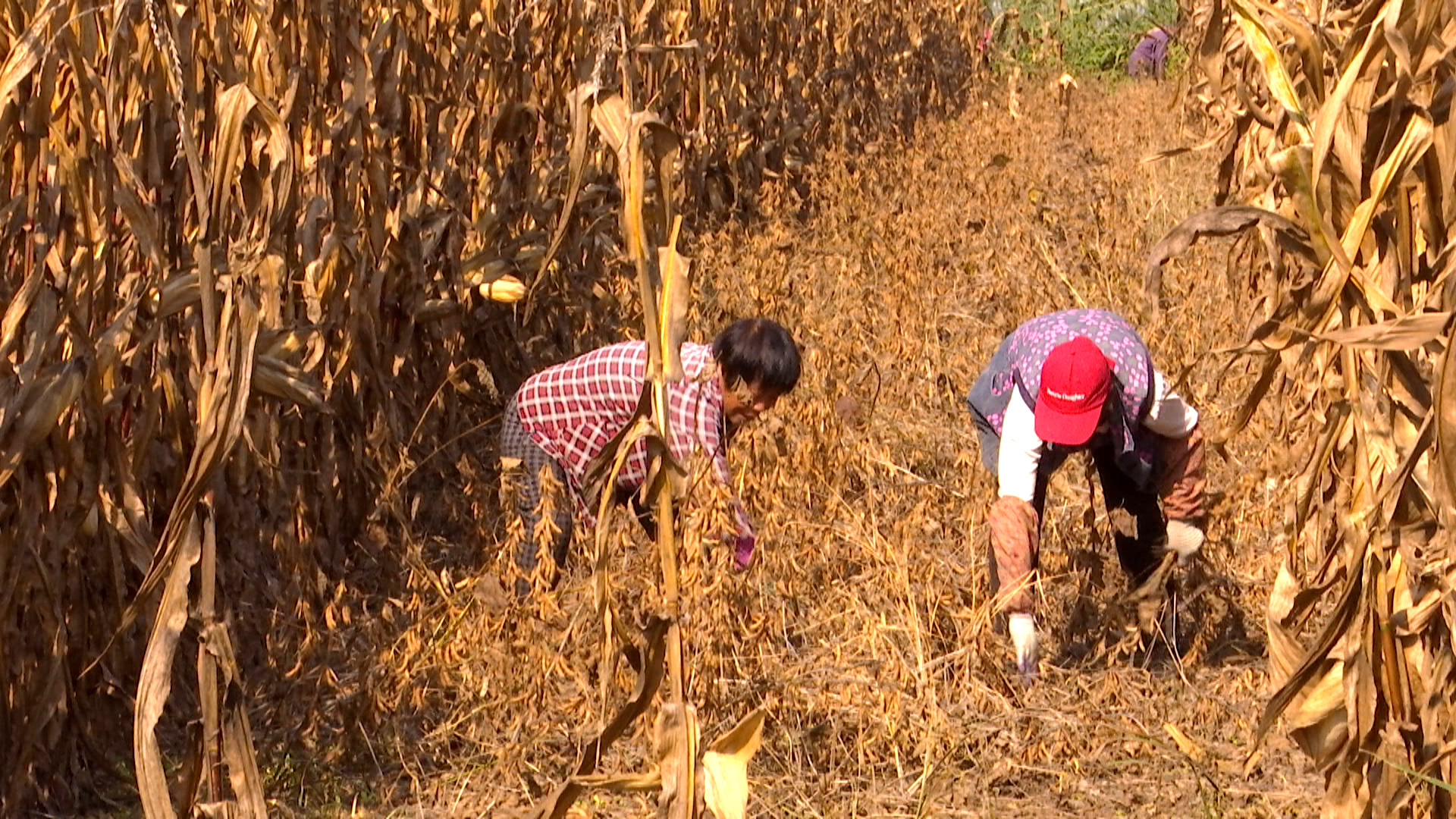 据悉,玉米与黄豆套种是高效生态种植模式,黄豆根部的根瘤菌能固定空气中的氮元素,为玉米生长提供天然养分;玉米高大的秸秆可为黄豆遮挡强光、保持土壤湿度,二者互补共生。这种模式不仅盘活土地资源、实现“一地双收”,还为后续水稻种植打下良好地力基础。“这一季套种,能改善土壤条件,提高来年水稻产量。”陶檬补充道。