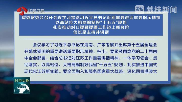 会议传达学习了习近平总书记在听取西藏自治区、新疆维吾尔自治区党委和政府工作汇报时的重要讲话精神,强调,党的十八大以来,习近平总书记从党和国家事业发展全局的战略高度,亲自为西藏、新疆工作把舵定向。总书记的重要讲话具有很强的政治性、指导性和针对性,是新时代党的治藏方略和治疆方略最新成果。要完整准确全面贯彻新时代党的治藏方略和治疆方略,进一步增强做好对口支援工作的政治自觉和使命担当,确保党中央决策部署落到实处、见到实效。要紧扣铸牢中华民族共同体意识主线,实施更多民生工程,促进各民族交往交流交融,让江苏与西藏、新疆群众的心贴得更近。要聚焦高质量发展首要任务,深化产业协作、园区共建、清洁能源开发等领域合作,科学编制“十五五”对口支援规划,推动我省援藏、援疆工作迈上新台阶。