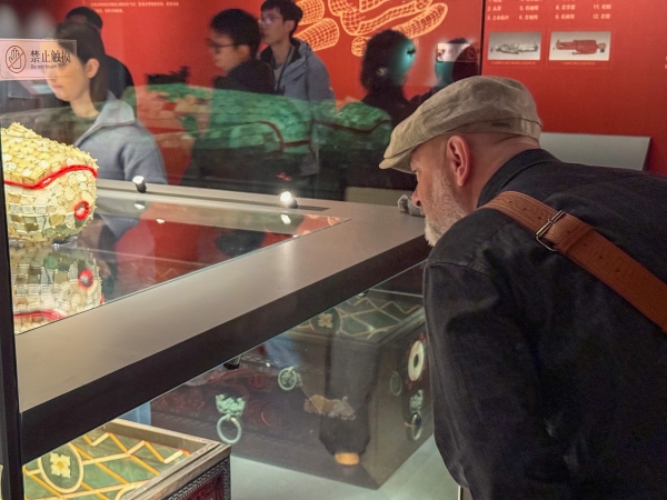 打卡首站——大云山汉王陵博物馆,依托大云山西汉王陵的考古发掘成果而建,生动展现西汉历史风貌与江都王刘非的生活图景。大云山西汉王陵,曾入选“2011年全国考古十大发现”,出土金缕玉衣、玉棺、编钟、编磬等万余件珍贵文物。参观现场,“‘玉’得永生”特展系统呈现中国葬玉传统,尤其是汉代巅峰时期的工艺精华,让海外视频博主们尽享文化盛宴。
