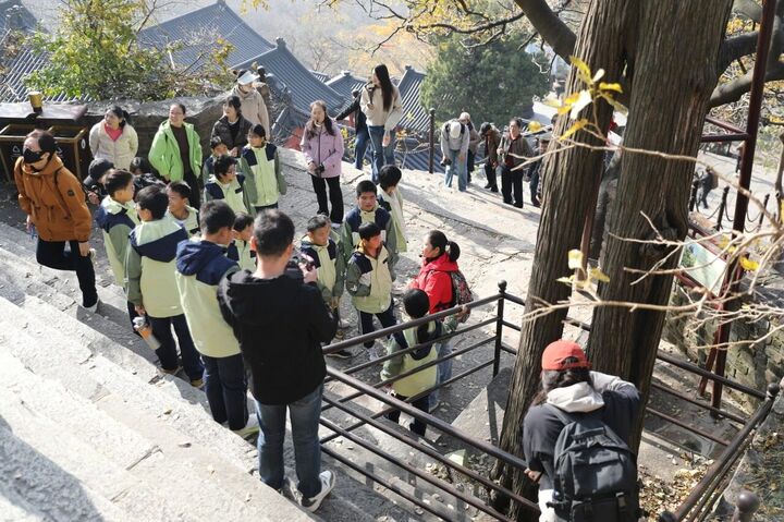 连云港师范学院的同学们激情诵读描写银杏的历代佳作,叮叮书房的竹子老师围绕千年银杏树,深入浅出地讲解银杏树与银杏叶的奥秘,带领大家读懂银杏的“自然智慧”。同时通过共读绘本《一片叶子落下来》,让孩子们在温馨互动中领悟生命的温暖与力量。活动的后半段,连云港导游协会的张红艳老师化身“文化向导”,带领大家探访了三元宫、大圣殿与水帘洞,全方位呈现花果山的千年文脉与西游魅力。