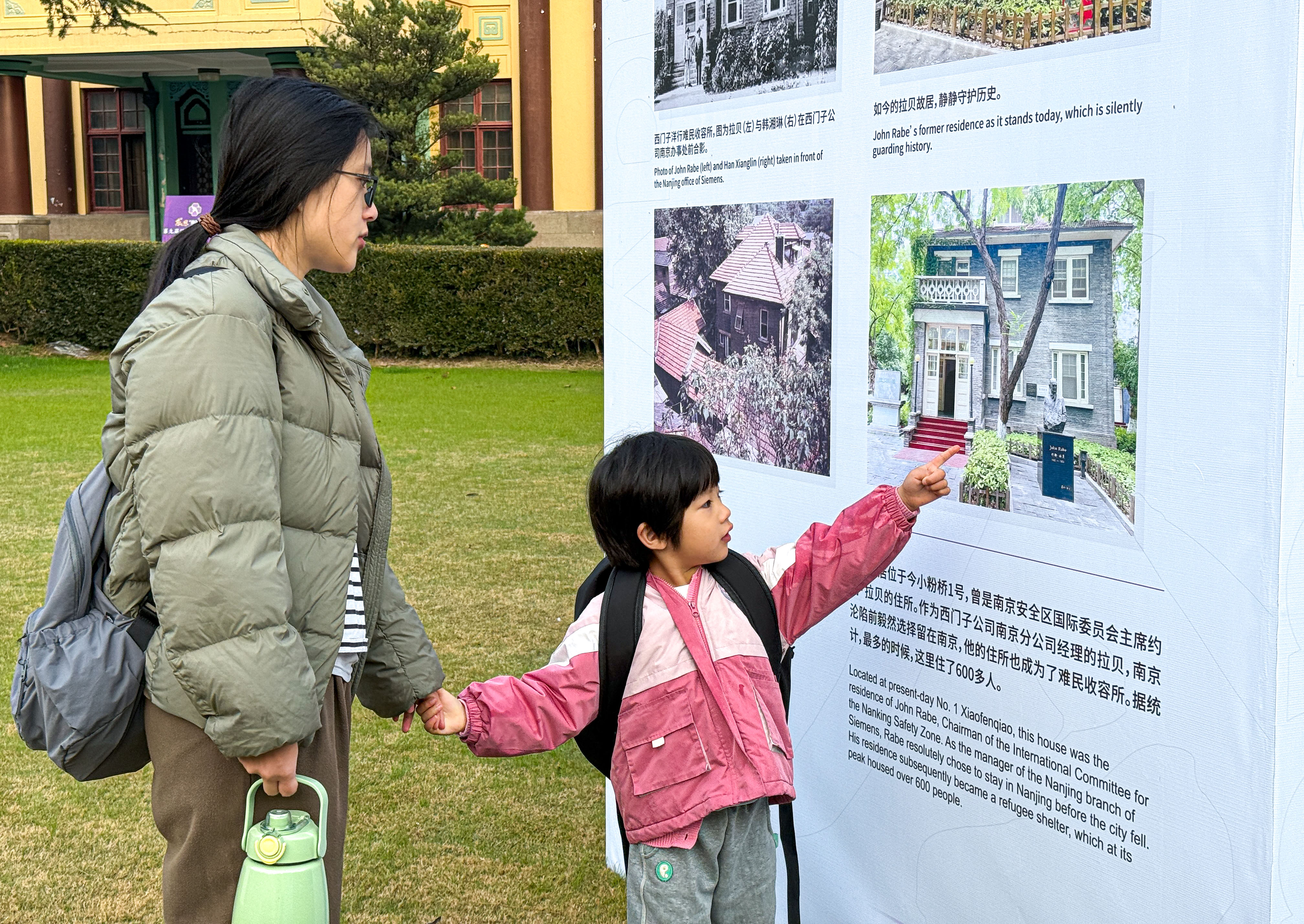 博西家电公司员工高女士蹲下身,指着展板上的历史图片,一张一张地向她5岁的女儿讲解,“南京大屠杀的历史是不可磨灭的。我们要记住的,不仅是苦难,还有那些在至暗时刻伸出援手的人们。唯有不忘,才能更好地前行。”