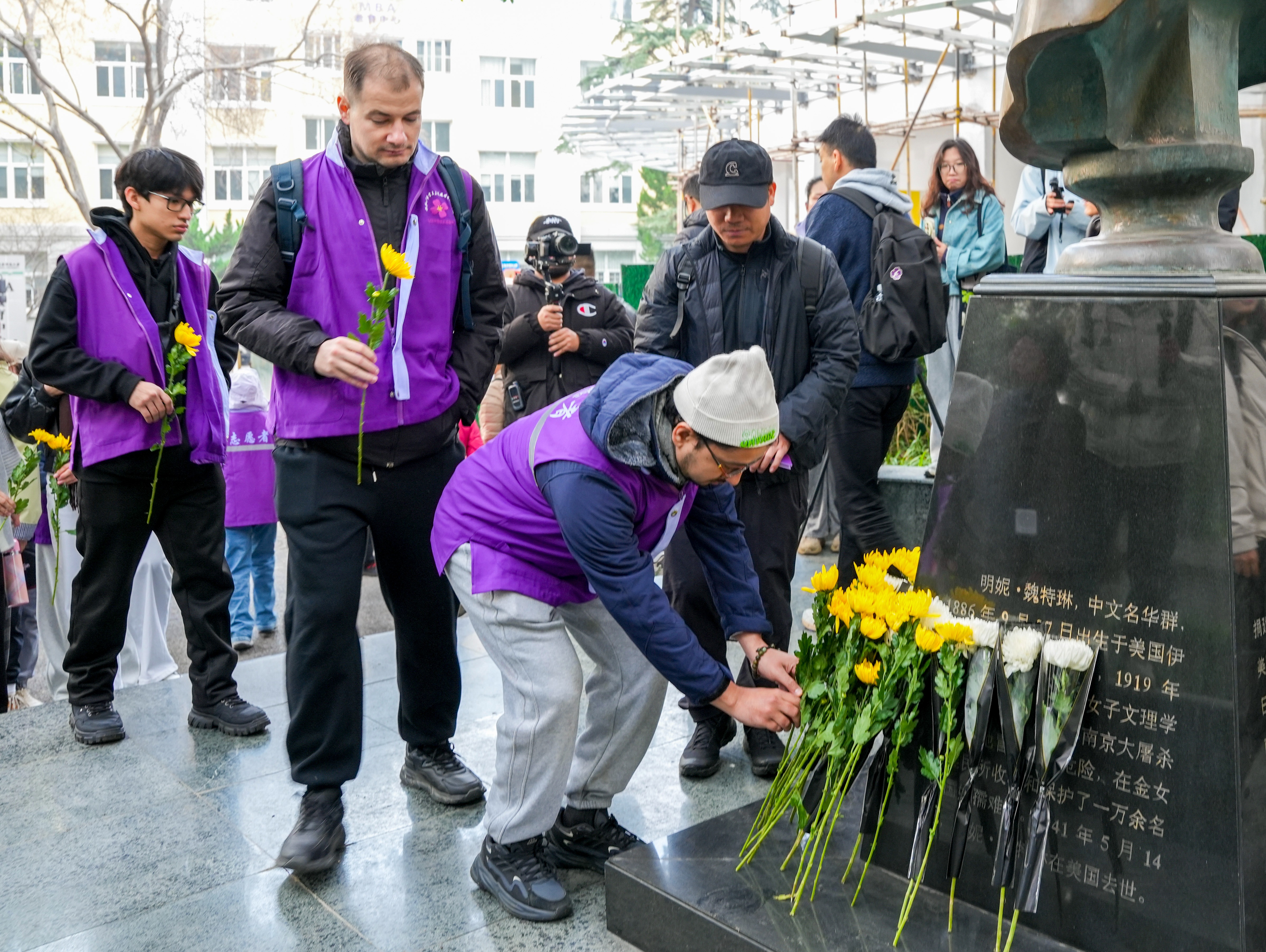 南京师范大学随园校区,外国学子在魏特琳雕像处献花。