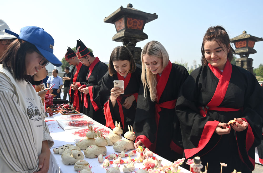 2023年9月16日,“丝路起点文明根脉”2023西安丝路留学生交流活动在西安启动,来自西安交通大学的百名中外大学生着汉服、行汉礼,通过沉浸式体验,了解中国传统文化。这是中外大学生在交流活动上了解陕西非遗。
