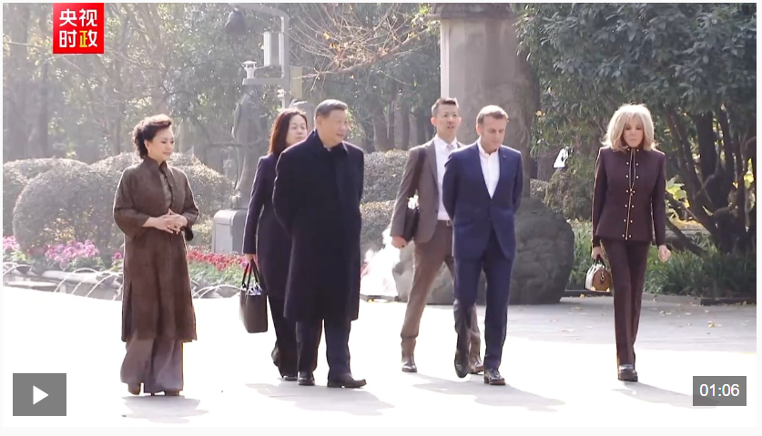初冬的都江堰,苍山掩翠。马克龙夫妇抵达时,受到习近平和彭丽媛热情迎接。两国元首夫妇沿堰功道边走边谈。习近平介绍都江堰历史和意义,指出都江堰水利工程是全世界迄今唯一仍在使用的古代水利工程,也是人类与自然和谐共生最早的成功实践之一,修建过程充分反映了中华民族自强不息、不畏艰难、勇于开拓的精神。两国元首夫妇落座怀古亭,临水品茗,纵论天下。