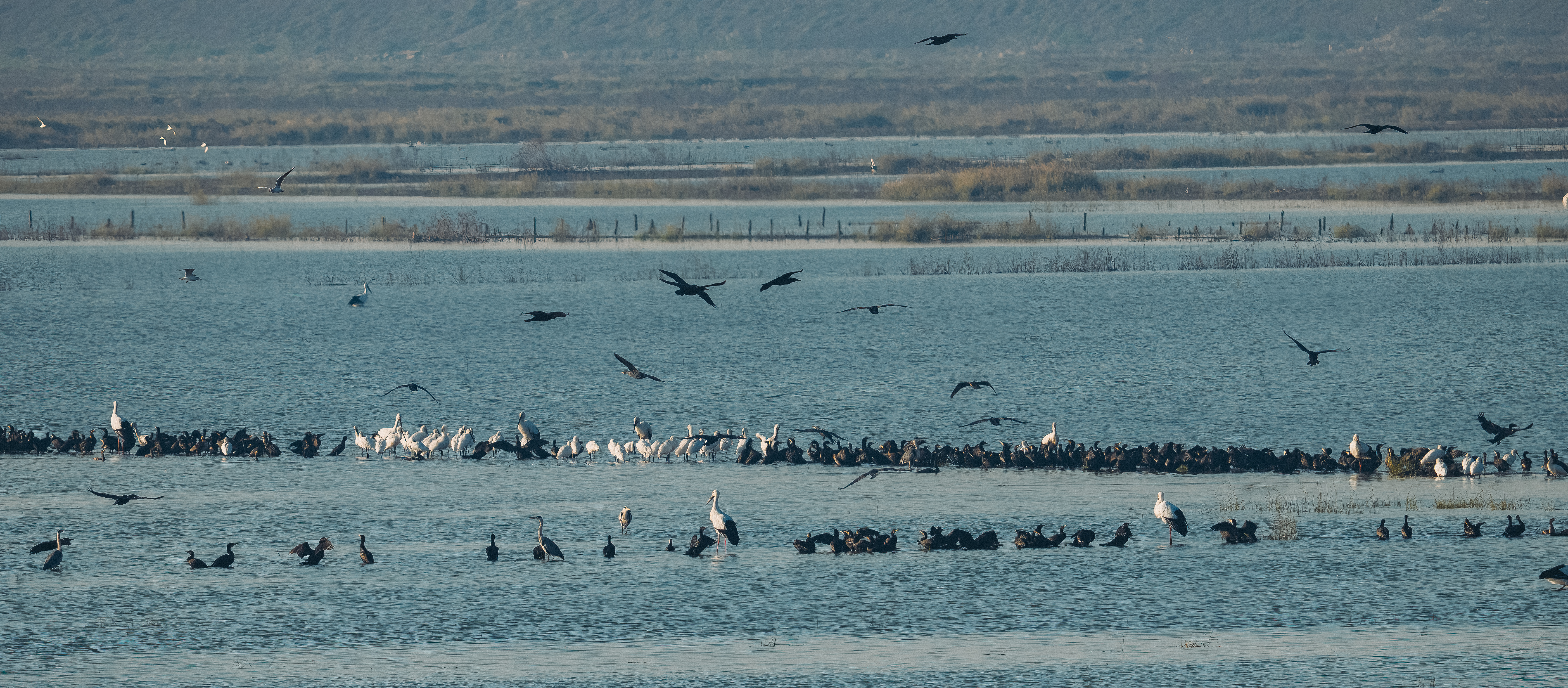 石臼湖的鸬鹚群和东方白鹳等。 哈敏哲 摄