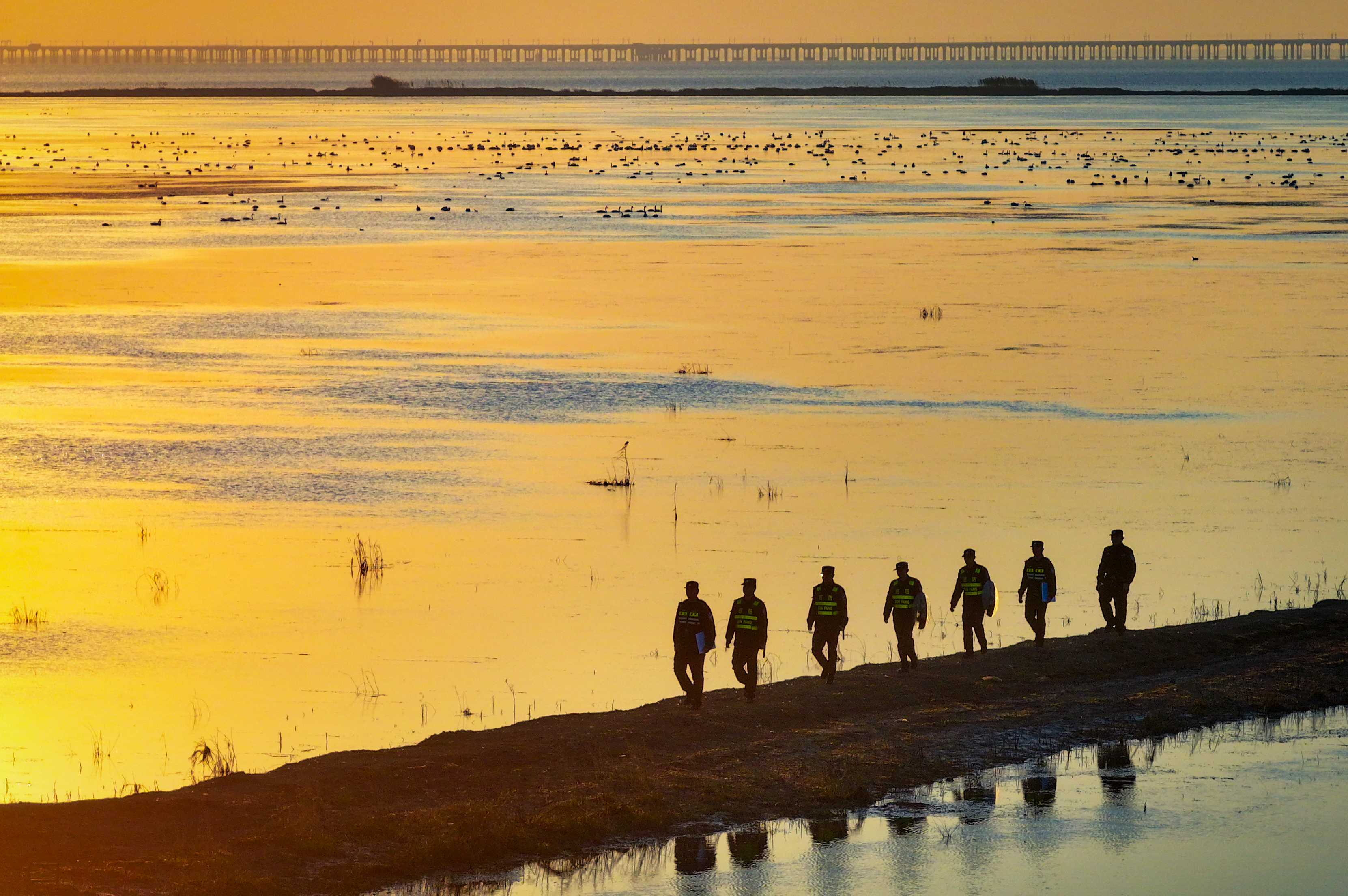 手举“礼貌观鸟、不扰生灵”的提示牌,不时用望远镜关注石臼湖湖面情况……连日来,这已成为和凤镇派出所副所长邹斌的工作日常。2020年以来,以邹斌等为核心成员的“天鹅护卫队”一直在路上,队员们通过步巡与车巡相结合的方式,在广阔的湖岸线往复巡查,被当地群众和摄影爱好者亲切地称为“天鹅爸比”。