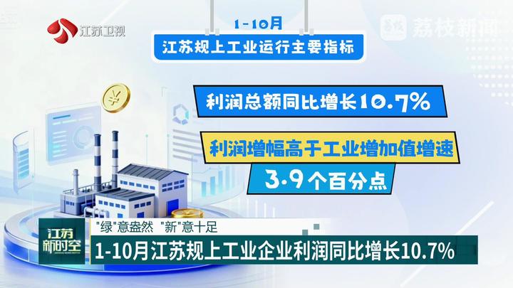 省统计局最新数据显示,今年1-10月,江苏规模以上工业企业实现利润同比增长10.7%,高于全国8.8个百分点。