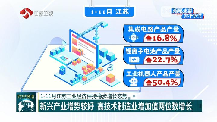 1-11月,江苏新兴产业增势较好,16个先进制造业集群全部实现正增长。电子、通用设备、电力热力等行业增速高于全省平均水平,贡献显著;先进制造业如集成电路、锂离子电池、工业机器人等产品产量分别增长16.8%、22.7%和50.4%,装备制造业对工业增长的贡献率达83.2%。11月当月,全省高技术制造业和数字核心产品制造业分别增长10.4%和10.2%,显示出工业结构持续优化,新兴动能不断壮大,为江苏经济稳中有进提供关键动力。