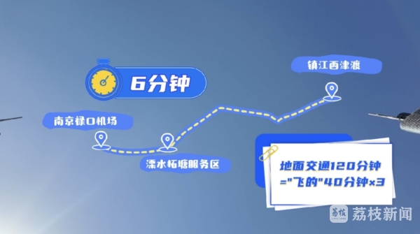 从镇江到南京禄口国际机场,如果选择自驾或是乘坐大巴,时长在一个半小时到两小时不等,如果打个“飞的”呢?直升机从镇江西津渡起飞,以300米左右的高度向南京方向平稳飞行。40分钟后,直升机飞越约100公里航程,稳稳降落在溧水柘塘服务区,距离南京禄口机场车程仅约6分钟。