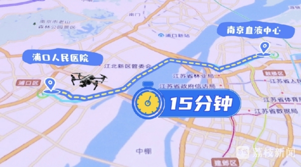 下午四点多,城市出行晚高峰就要来了,即便立即出发,通过地面交通从南京血液中心到浦口人民医院最快也要四十到五十分钟,而此刻用血肯定是“救命血”。从申请航线、到准备血源,再到按要求装箱、起飞……短短几分钟,“救命血”已经搭上直达“空中快车”,飞往目的地。从南京血液中心到浦口人民医院的飞行总时长只要15分钟。