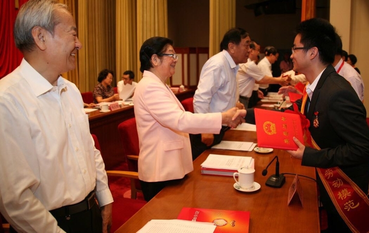 全国纺织工业劳动模范王水(右一)