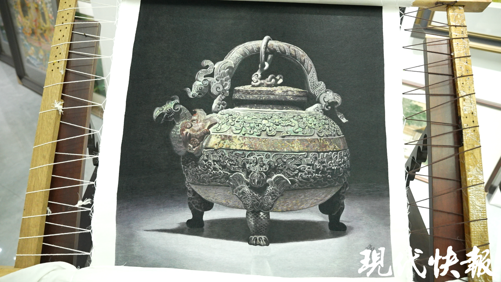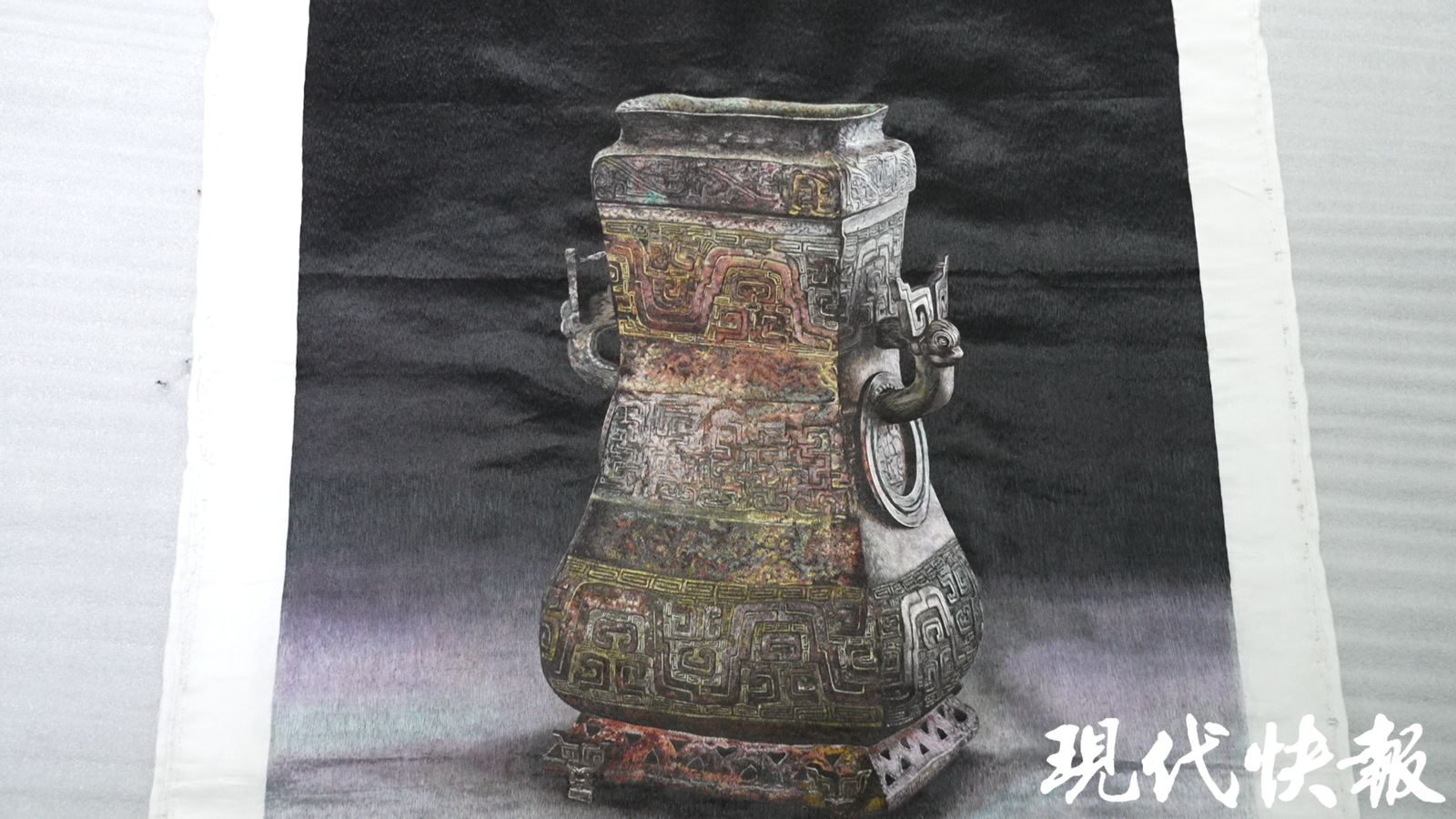 远看是厚重的青铜器,走近细观:那金属的质感、莹润的光泽,竟全是由千丝万缕的细线勾勒出来的。“出圈”的青铜器绣品,在1000多种色彩的细微变化之间,折射出深浅不一的墨绿色,呈现出浑然天成的青铜质感。