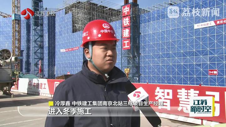 荔枝新闻中心记者沈杨说:“这里是南京北站的建设现场。今年元旦三天假期,南京的最低温度已经达到-4℃,但这里却是一片热火朝天的景象。数千名建设者坚守岗位,以只争朝夕的奋斗姿态,抢抓施工黄金期,用汗水浇筑着这座长三角未来的交通新标杆。”