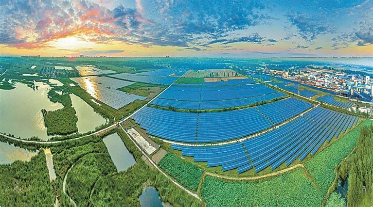 徐州的创新,更在于将生态修复与绿色产业深度融合。在淮海国际港务区垞城矿采煤塌陷区,一排排深蓝色光伏板整齐铺展在水面上,形成“上可发电、下可养殖”的复合型产业基地。项目通过在水域上方架设光伏阵列实现高效发电,同时利用光伏板遮阳效应抑制藻类繁殖、调节水温,为鱼、虾等水产提供优质生长环境,实现土地资源立体化利用,借“光”生“金”,实现绿色发展。