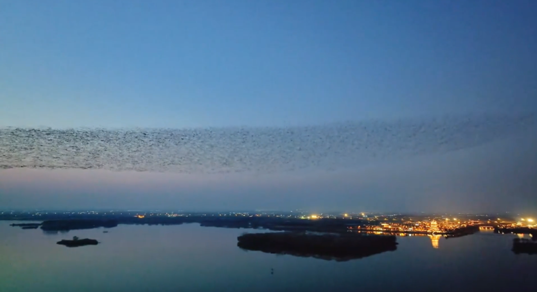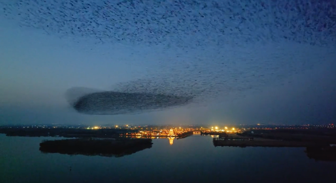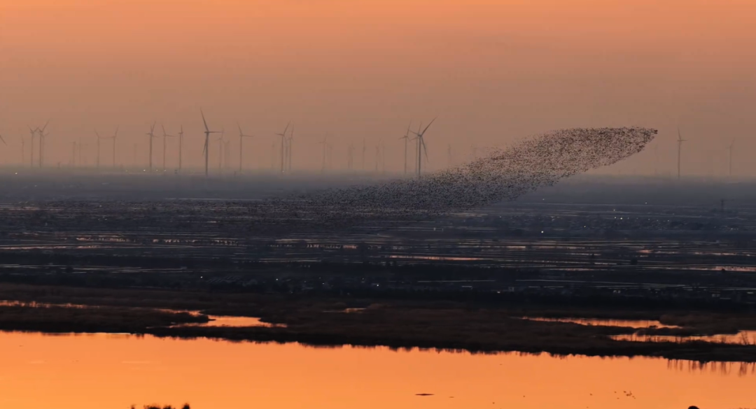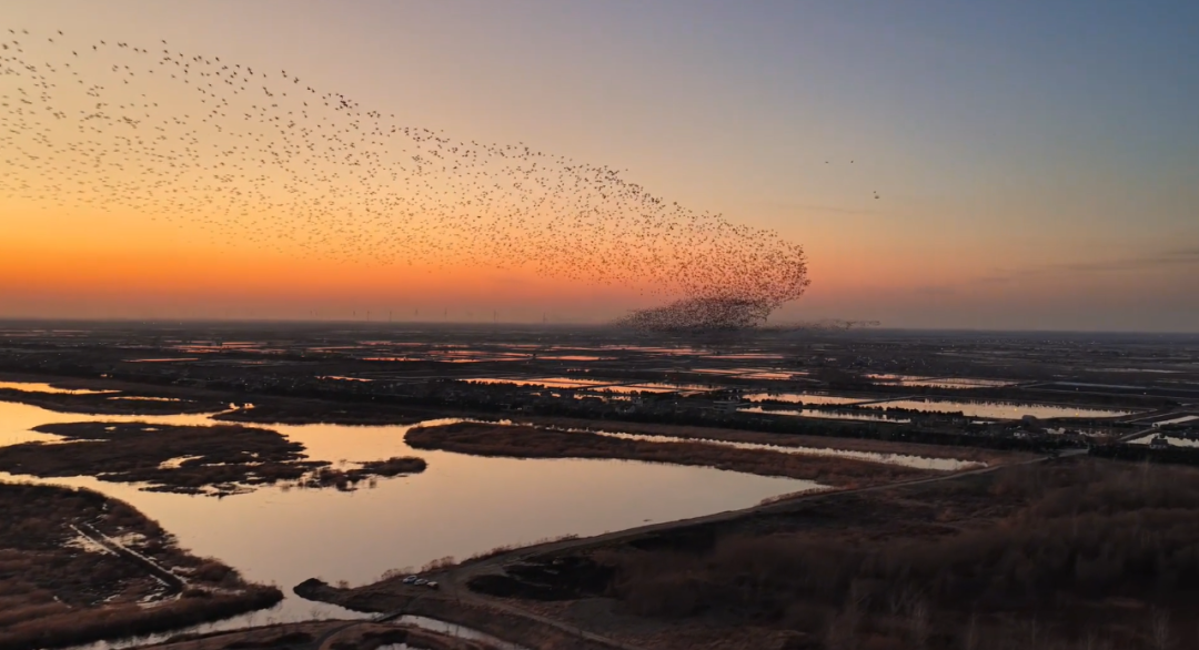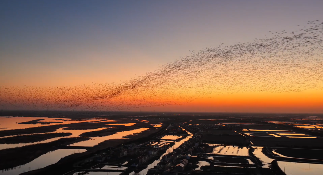 数万只飞鸟在落日余晖中