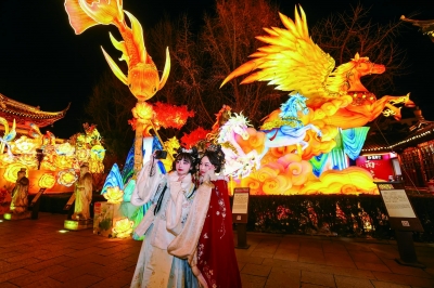 在大成殿展区,市民游客在灯组前合影留念。