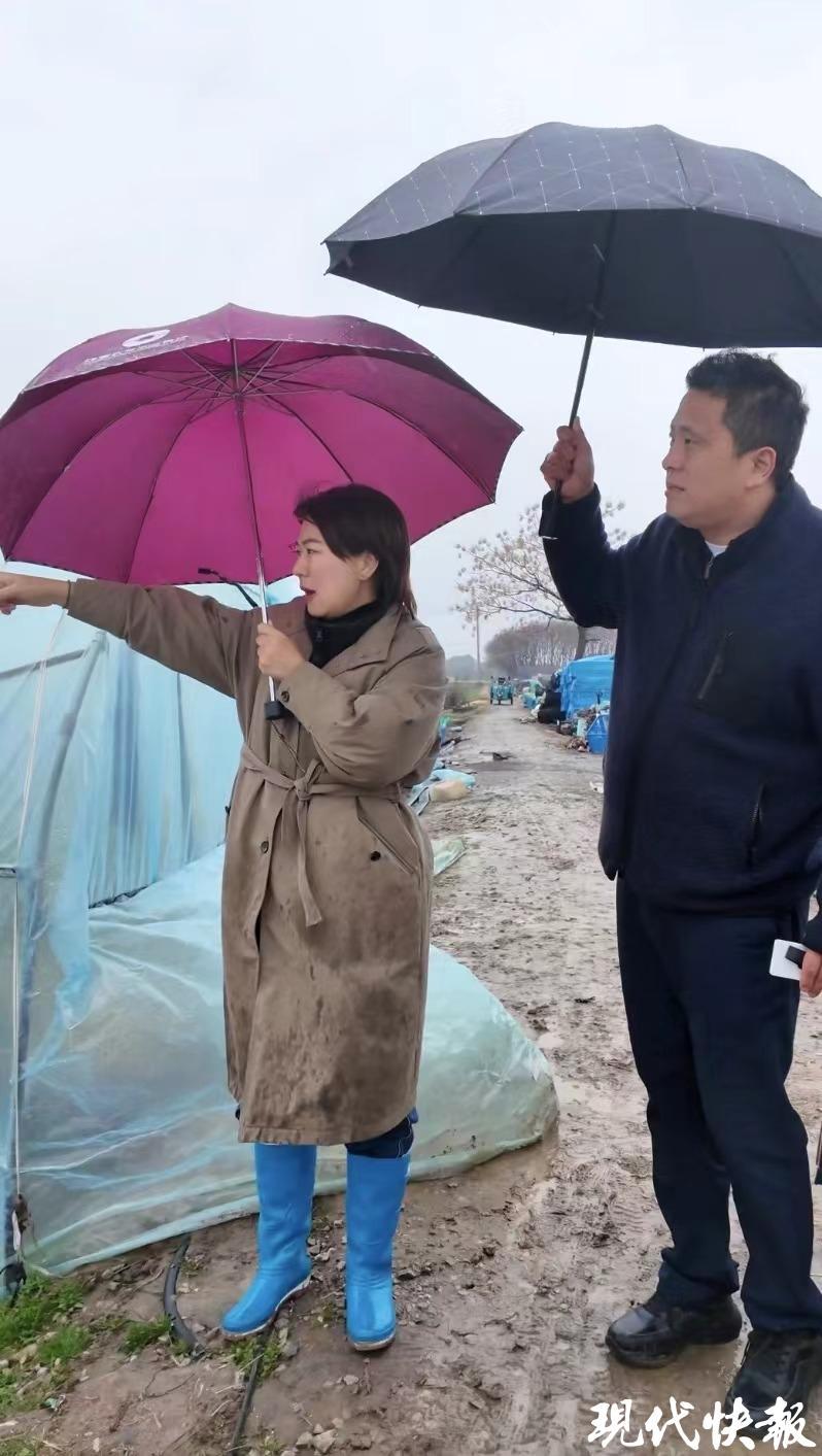 大林村是溧阳市古县街道下辖行政村,白芹种植园就在村委东侧。下午2时30分左右,空旷的田间寒风呼啸。气温只有3摄氏度左右,又恰逢下雨,冷风灌进衣服,令人不住打颤。田头的土路早被雨水浸透,泥泞不堪,到处是积水。由于事先没想到直播现场的环境会这样恶劣,记者未准备雨靴,在跟着费婧来回跑了两趟后,鞋子和裤管就已经全湿了。