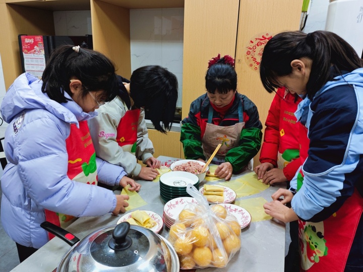 洗菜、切配、拌馅、煎炒……小小的厨房里香气弥漫。张嘉靓格外认真,她的母亲是安徽人,父亲在无锡打工。黄天航学得格外认真,手指被肉馅沾得黏糊糊也不在意:“我要给妈妈做最好吃的肉塞面筋,她平时太累了。”