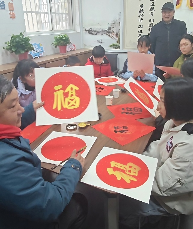 上午9点,寒托班的第一堂课正式开讲,云林街道团工委副书记朱力涛早早便带着红纸和毛笔来到了课堂。“同学们,你们知道‘福’字为什么要倒着贴吗?”问题一出,孩子们争先恐后地举手。