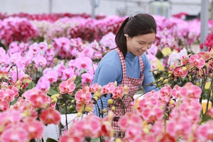 村党总支投入资金,建起8000多平方米的高标准温室大棚,配套专业温控、灌溉系统;李国栋负责花卉种植所需的种苗引进、技术管理、日常养护以及市场销售等全流程运营工作,凭借成熟的花卉培育技术和完善的销售渠道,让蝴蝶兰、凤梨等高端花卉在这里实现规模化、标准化种植。“这里的土地租金提高到了每亩1250元,再叠加大棚租赁收益,每年为集体增收38万元。”谢林深有感触地说道,闲置低效土地摇身一变成为高效农业产业基地,不仅实现了花卉产业的落地发展,更为村集体经济带来了实实在在的收益。