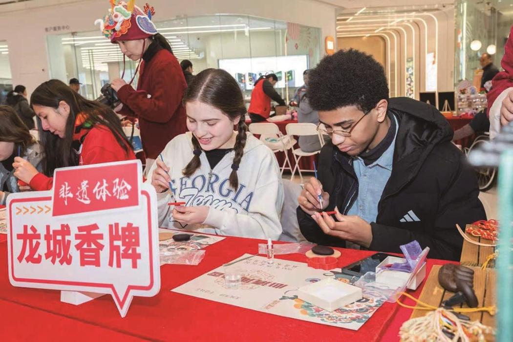 除了美食盛宴,文明集市也颇具人气。写春联、剪窗花、福字拓印,非遗传承人现场制作龙城香牌、吹糖人、捏面人等,让大家在品尝各色包子的同时感受浓浓年味。现场还邀请了多位外籍友人体验中国传统文化,他们尝试做龙城香牌、写福字,虽然手法生疏,但神情专注,喜悦之情溢于言表。