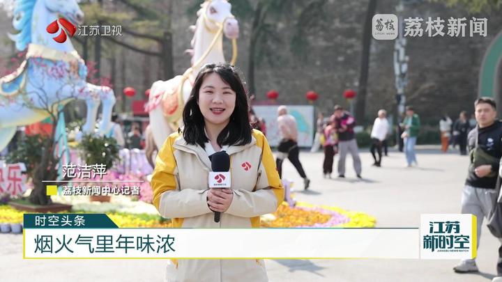 荔枝新闻中心记者范洁萍说:“这里是南京玄武湖景区,春节假期第一天,这里迎来了大批游客,记者看到景区里新增了马年主题的园艺景观,很多人在这里拍照打卡,感受新春的氛围。”
