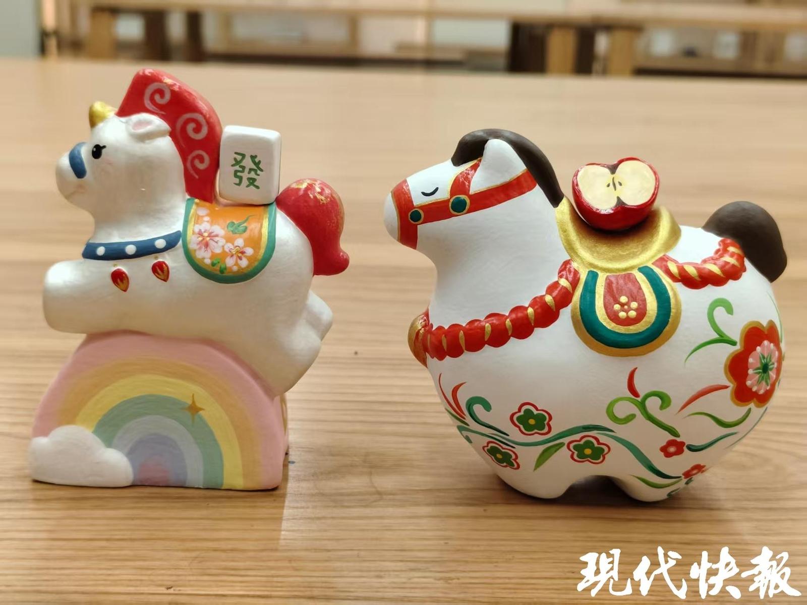 二楼生产车间,工作台一字排开,素坯、颜料、细毛笔整齐摆放,细笔在圆润的泥坯上流转,一匹匹身披樱花纹样、驮着红苹果的小白马,在指尖渐渐鲜活起来。00后设计师尤雨婧也加入了彩绘工作,“为了赶订单都在加班,虽然很辛苦,但看到惠山泥人被越来越多人喜欢,很高兴很自豪”。