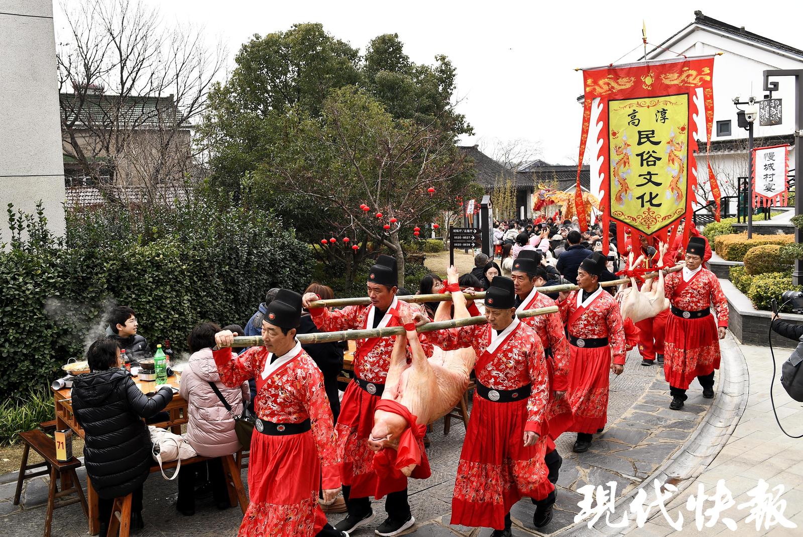 清晨薄雾尚未散尽,南京市高淳区桠溪镇大山村的村民们已开始忙碌,待到日头渐高,一幅热气蒸腾的画卷徐徐展开——100多张八仙桌整齐列阵,如一条静卧的长龙,沿着乡村的小路铺展延伸。提前彩排的锣鼓声、熙熙攘攘的谈笑声交织融合。从附近村镇赶来的乡亲、慕名而至的游客,千余人陆续落座,一张张笑脸在冬日暖阳下显得格外明亮。