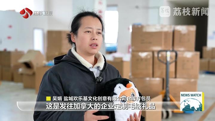 盐城欢乐基文化创意有限公司仓库打包员吴娟说:“这是发往加拿大的企业定制毛绒礼品,按照客户要求检查三次毛绒玩具的缝线填充和LOGO的印制效果,一点差错都不能出。我本来订了回江西老家的高铁票,但现在看到订单量这么多,我就主动退票了。”