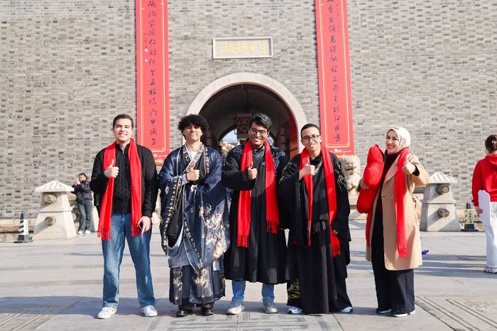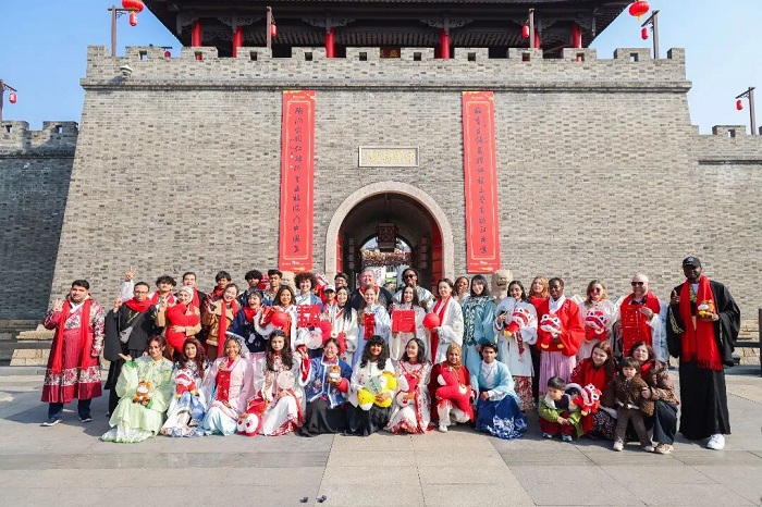 来自乌兹别克斯坦的石龙,在挑选到心仪的汉服后,又热情地帮同伴挑选合适的款式。2025年,石龙曾登上总台元宵晚会无锡分会场,向全球观众展现江南韵味与无锡非遗魅力。2026年新春将至,他表示,将继续当好中国传统文化的传播者。换上飘逸的汉服,外籍友人瞬间融入古色古香的古镇氛围。青衫罗裙与飞檐翘角相映成趣,构成一道别致动人的风景线。大家在中华德城门下并肩合影,快门声声,定格下这份跨越国界的新春美好。