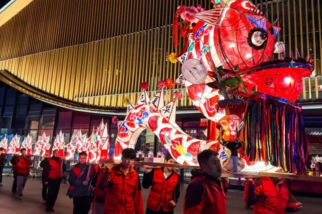 非遗烟火润人心,百姓在传统韵味中感受年的厚重与温情。舜山小镇的“新春非遗纳福年”暖意融融,45位小伙子默契配合,肩扛着38节、长约60米的板凳龙蜿蜒游走,每节十几斤重的龙身,被LED灯点亮得熠熠生辉,古老民俗在科技的加持下焕发新生机。不远处,鱼灯摇曳生姿,与往来人群相映成趣;非遗集市上,常州麻糕、萝卜干炒饭的香气四处萦绕,剪纸、拓印、虎头鞋等互动项目前人头攒动,百姓们边尝美食、边玩非遗,在烟火气中品味最地道的江南年味。