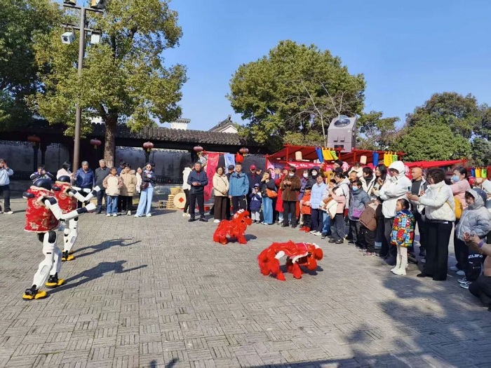 走进荡口古镇孝义广场,最吸睛的当数机器人科技表演秀。数只身披红金醒狮战甲的四足机器人,伴着动感鼓点灵活翻腾、跳跃、摆尾、颔首,动作惟妙惟肖,萌趣又威武;机器人同步舒展身姿,与四足机器人默契共舞,科技感与年味完美融合。表演间隙,四足机器人缓步走近孩童,伸手互动、趣味拜年,引得现场欢声不断。“第一次见到会跳舞、会拜年的四足机器人,太新奇了!”小学生周同学兴奋地说。传统舞狮与赛博舞狮隔空呼应,一古一今,让传统文化在科技赋能下焕发新生。