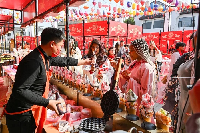“回荡口过大年”市集与纳福游园会同步升温,烟火气与互动感兼具。市集上,玉兰饼、油酥饼等本地小吃香气扑鼻,非遗手作、文创好物琳琅满目,游客边逛边吃,重拾儿时年味。投壶、捶丸、蹴鞠等传统游艺备受亲子家庭青睐,通关游客可领取红丝带、祈福牌,在廊下系愿祈福,寄托新春美好期盼。“有集市可逛,有游戏可玩,孩子开心,大人尽兴。”来自苏州的自驾游客李先生直言不虚此行。