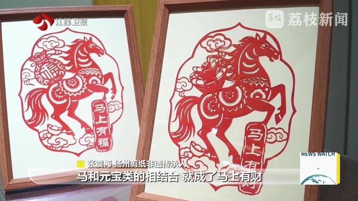 扬州剪纸非遗传承人张震梅说:“马和福字就是‘马上有福’,马和元宝类的相结合就成了‘马上有财’。将我们扬州园林里面窗花的元素也包含在里面。”