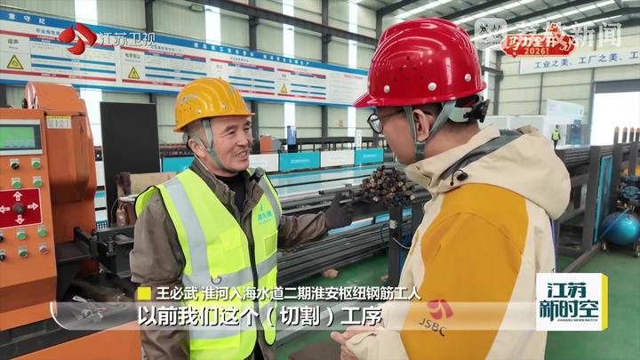 淮河入海水道二期淮安枢纽钢筋工人王必武说:“以前我们这个切割工序要四到五个人,一天只能出十吨钢筋,现在一个人就可以搞40到50吨的钢筋。”