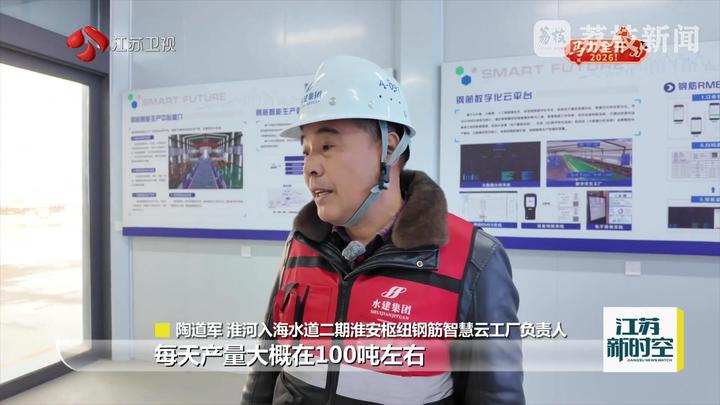 淮河入海水道二期淮安枢纽钢筋智慧云工厂负责人陶道军说:“每天产量大概在100吨,在效益方面我们提高在60%以上。”