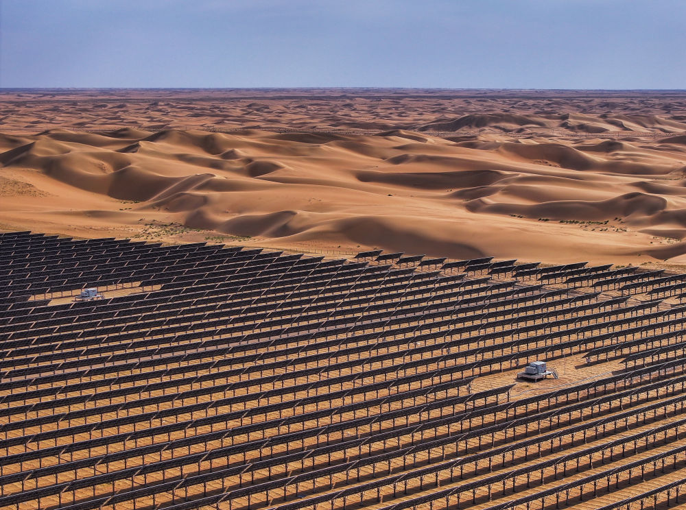 这是2025年6月5日拍摄的位于内蒙古巴彦淖尔市磴口县的乌兰布和东北部新能源基地100万千瓦光伏先导工程项目(无人机照片)。该项目地处乌兰布和沙漠。新华社记者连振摄
