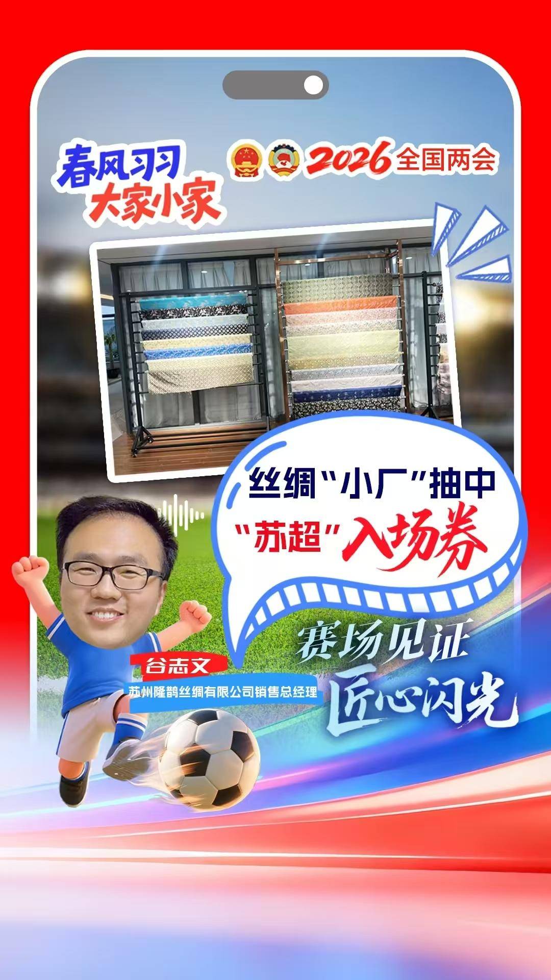 公司销售总经理谷志文表示,如果能有幸参与“苏超”,既是企业发展的新机遇,也让传统丝绸工艺有了走近大众的新舞台。“我们也盼着为热血沸腾的‘苏超’赛场,添几分江南丝绸独有的雅致韵味。”